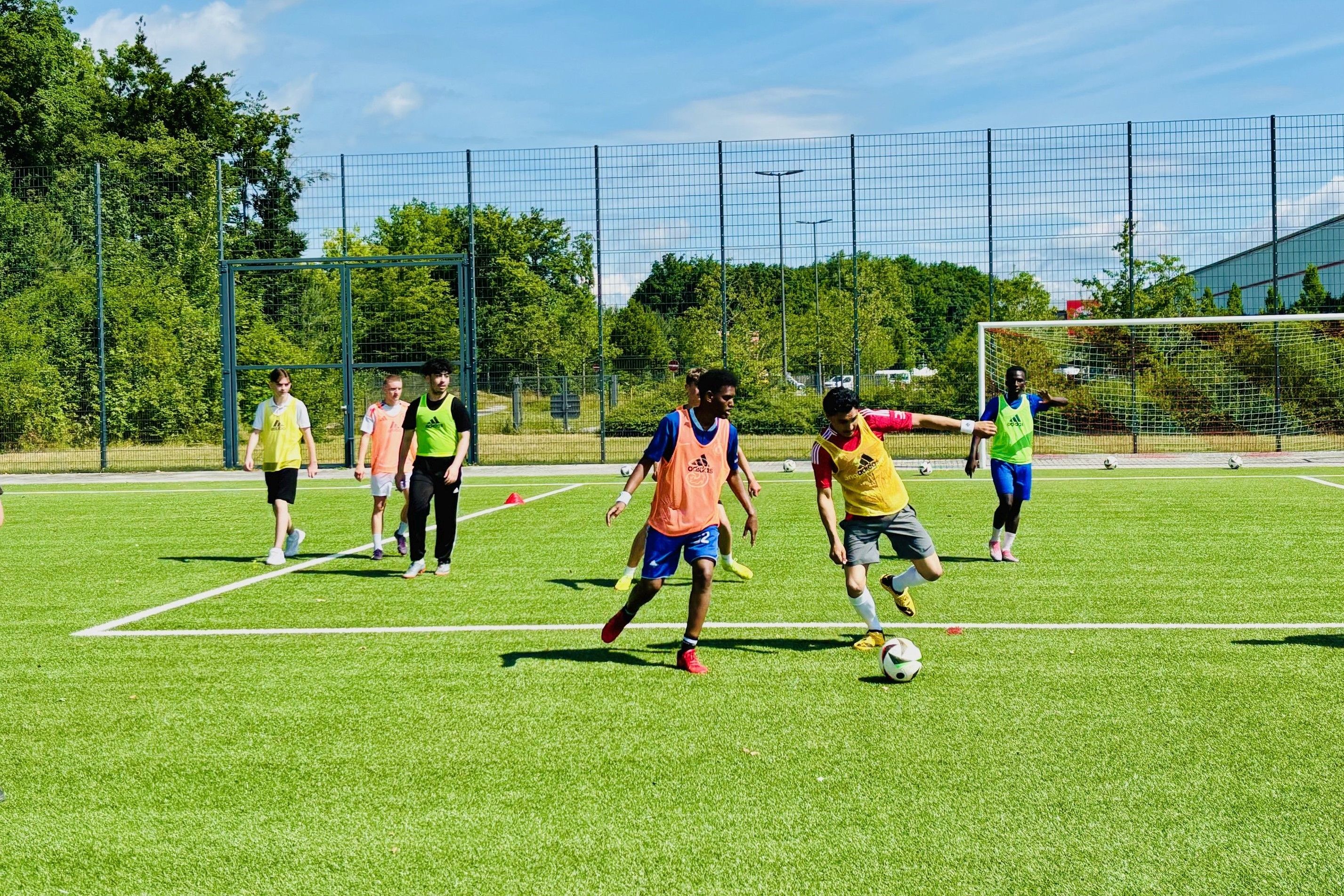 Vormittags wurden unsere Schüler*innen von lizenzierten Coaches deesBayerischen Fußball-Verbands trainiert, auf verschiedenen Niveaus von Anfänger*in bis Vereinsspieler*in. Das hat allen große Freude bereitet, und die Trainer*innen hatten noch gute Tipps, wo man mit dem „Bolzen“ weitermachen könne. Vor allem im Bereich Mädchenfußball taten sich tolle Möglichkeiten auf.