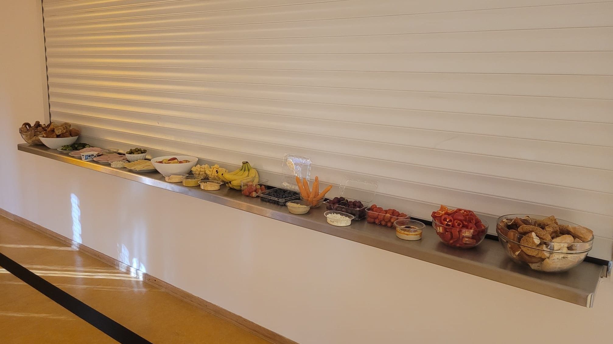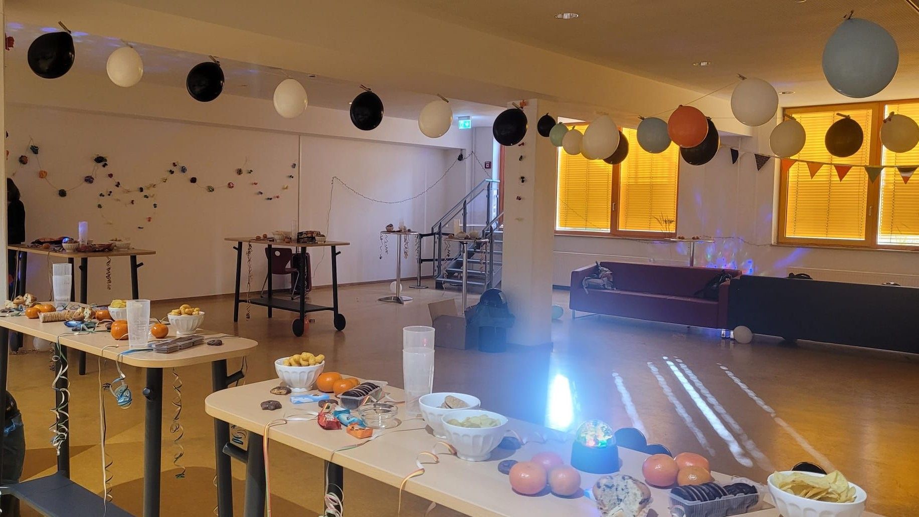 Einige Schülerinnen blieben gleich nach dem Unterricht da und unterstützten die Lehrerinnen beim Aufbau: Unsere neue „Cafeteria“ wurde festlich hergerichtet, Luftballons aufgehängt, Garderobenständer hergerichtet, Gläser beschriftet.