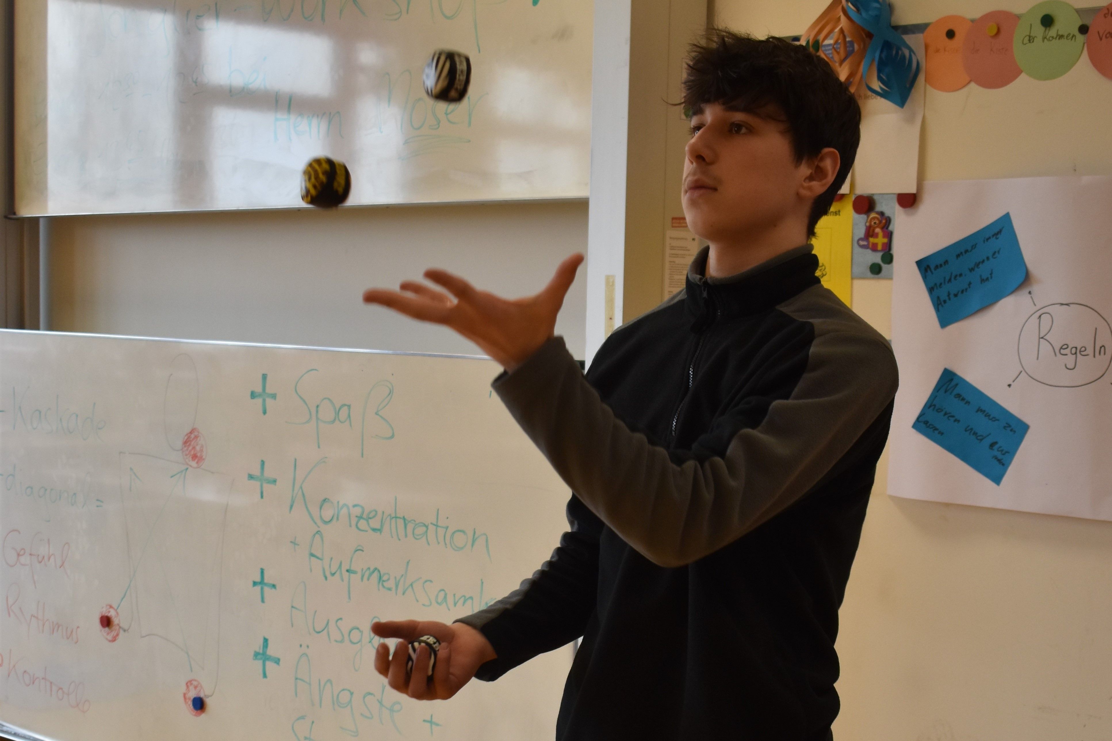 Turbulenter ging es in den Sportkursen zu. In einem Raum versuchten sich Schüler*innen am Jonglieren. „Am Anfang war es total schwer, aber jetzt geht’s schon“, freute sich ein Schüler. In den Turnhallen gab es Kurse zur Selbstverteidigung. Kostas Simeonidis bot Wing Chun an. Der deutsche Meister und Vize-Europameister in Karate, Arif Haidary, ließ die Schüler*innen auf Matten üben. Und Hermann Göb trainierte mit ihnen Taekwondo. „Und jetzt geht bitte zu eurem Partner. Und vergesst die Verbeugung nicht!“ Auf der Suche nach Schüler*innen aus der neunten Klasse wurde man im Yogakurs fündig. In Trainingsklamotten saßen sie auf ihren Matten und lauschten den Lehrerinnen Maria und Laura. „Die ganze Klasse wollte Yoga machen“, so eine Schülerin. „Eine gute Wahl!“