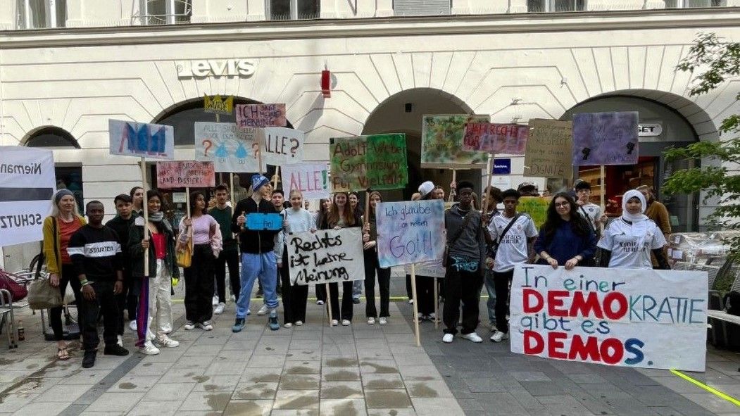 Am 15. Mai 2024 feierten rund 300 Schüler*innen verschiedenster Schulformen in der Münchner Innenstadt den 75. Geburtstag des Grundgesetzes