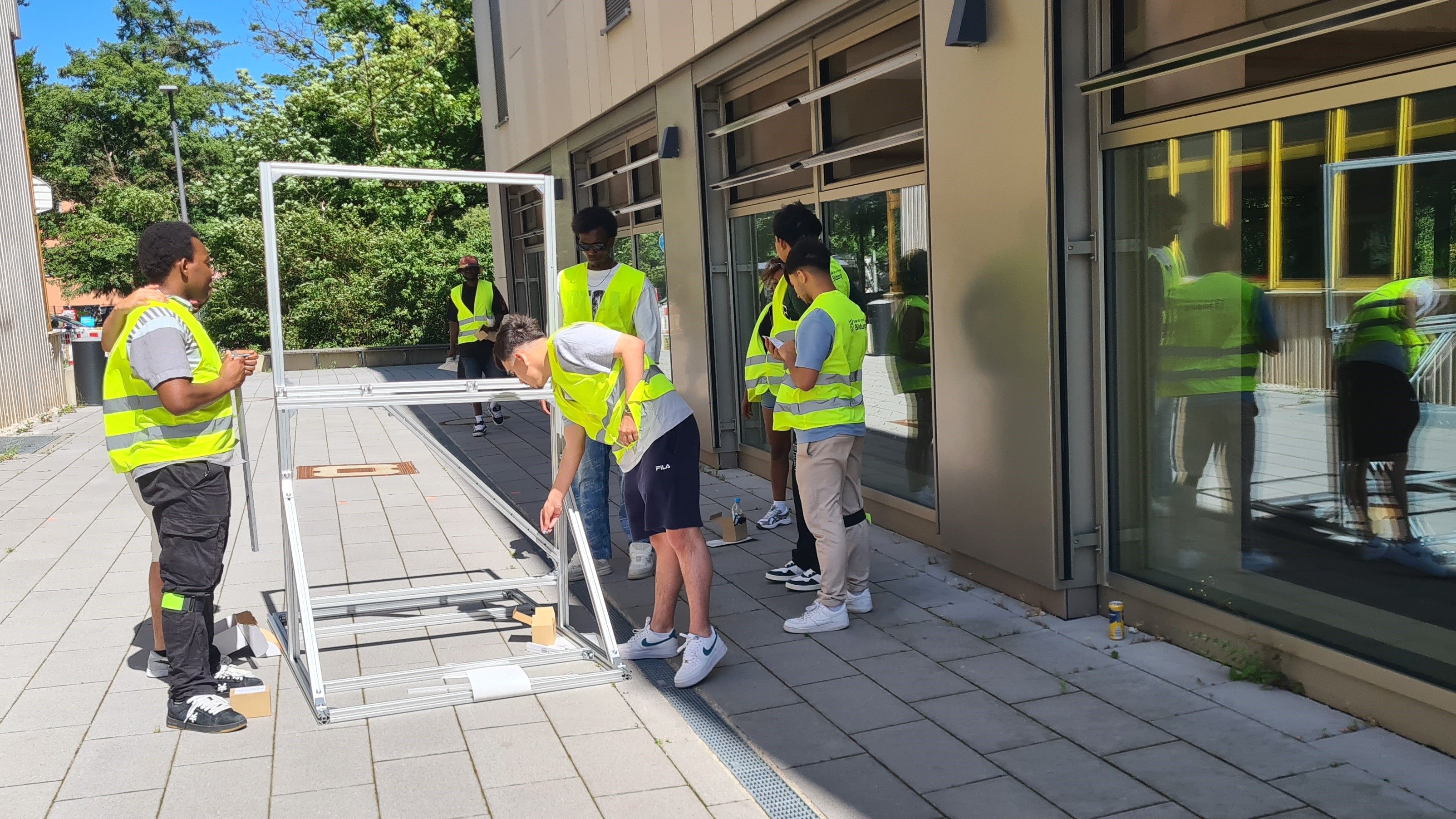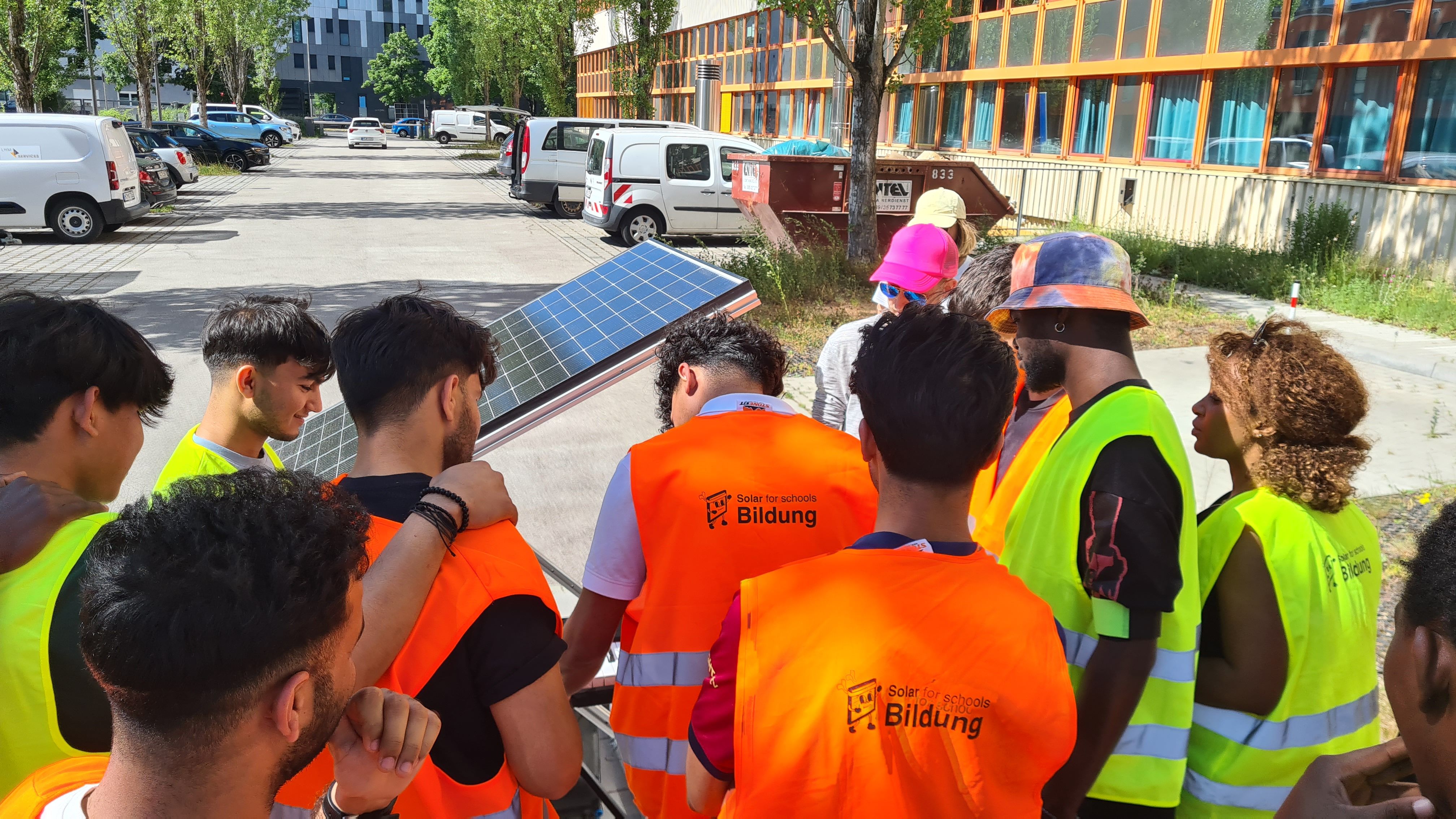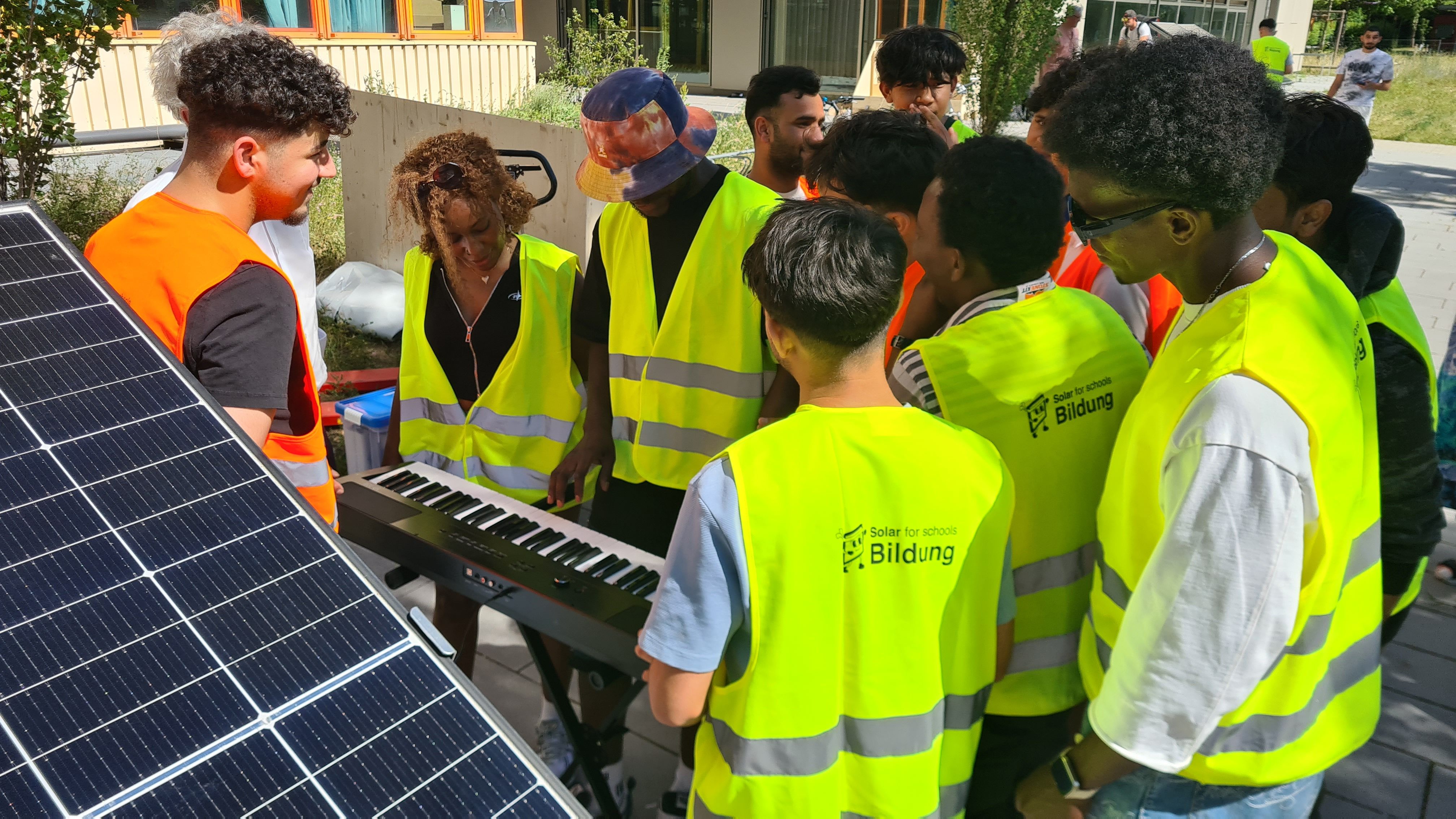 Um den Schüler*innen erneuerbare Energien bzw. Solarstromerzeugung näherzubringen und praktisch erlebbar zu machen, können seit Juni 2025 städtische Schulen bei der Stadt München bis zu vier mobile Solarmodule ausleihen. So kam es, dass die Schüler*innen der C8 auf dem Parkplatz hinter der Schule zwei portable Solarmodule aufbauten. Auch eine Gruppe von Lehrkräfte versuchte sich am Aufbau. Als die Module fertig zusammengeschraubt waren, konnten die Schüler*innen den erzeugten Strom dank des wunderbaren Sommerwetters sofort dafür nutzen, mit einem Keyboard zu musizieren und ihre Handys zu laden. Danach mussten die Module allerdings wieder abgebaut und ordentlich in den Kisten verstaut werden.